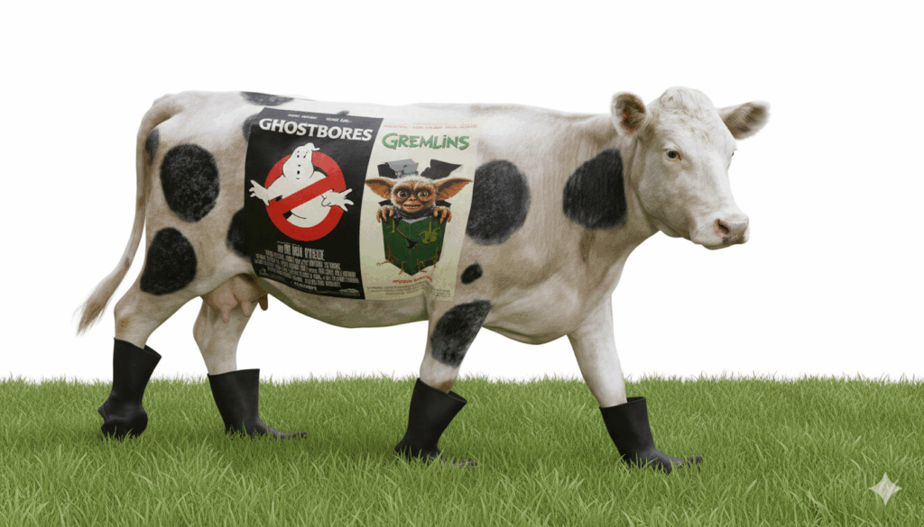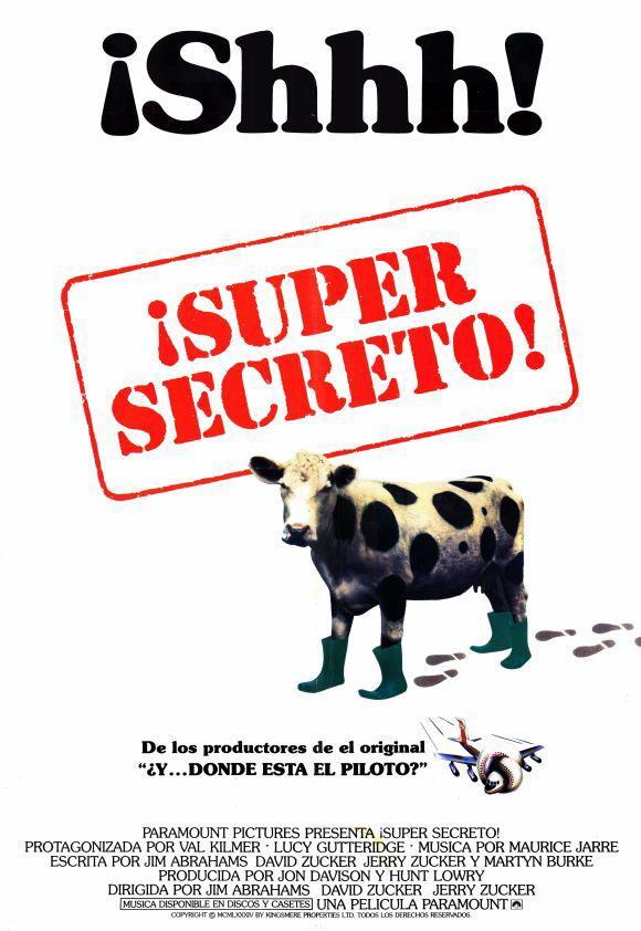34. EL AFICHE DE LA PELÍCULA SE BURLABA DE INDIANA JONES. El póster estándar utilizado para promocionar Top Secret! simplemente muestra la vaca con botas. Sin embargo, hubo un póster alternativo que tiene el gran lema: THE HERO IS A BERK (El héroe es un idiota). Aclaremos que «berk» es una vieja palabra del slang británico para «idiota» o «estúpido». De tal modo, esta versión es en realidad una parodia de un póster alternativo de Indiana Jones y el Templo de la Perdición, que tiene el mismo diseño y fuente, solo que el de Indiana Jones dice THE HERO IS BACK (El héroe ha vuelto)… Lo que se dice una cargada amistosa: después de todo, ambas películas fueron lanzadas por Paramount Pictures y ambas se estrenaron en 1984, con El Templo saliendo casi dos meses antes que «Top Secret!«