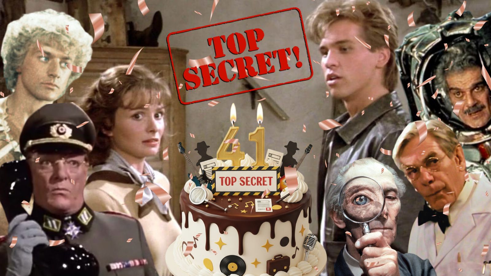 4. UNA ALEMANIA SITUADA ENTRE CALIFORNIA E INGLATERRA. El presupuesto de «Top Secret!» osciló entre los 8.5 y los 9 millones de dólares, un poco bajo para una producción de Hollywood habitual pero bastante grande para los ZAZ, ya que superaba el de su película anterior, «Airplane!«, que costó U$ 3.2 millones. Y a diferencia de «Airplane!«, que se filmó en California, el rodaje de «Top Secret!» se trasladó al Reino Unido, concretamente a Surrey, Inglaterra, y a los Shepperton Studios. BONUS: En el estudio, la producción encontró un modelo en miniatura de una ciudad que se usó para «Superman: La película» y lo reciclaron para la escena en la que Nick Rivers entra en una habitación y mira la calle a través de una ventana: el paisaje que observa es la mencionada maqueta, con unos bonitos ratoncitos corriendo por la calle. BONUS II: El diseñador de producción Peter Lamont también trabajaría en la película, conocido por su diseño de producción en las películas de James Bond, así como en varias de James Cameron, incluyendo «Aliens» y «Titanic«.