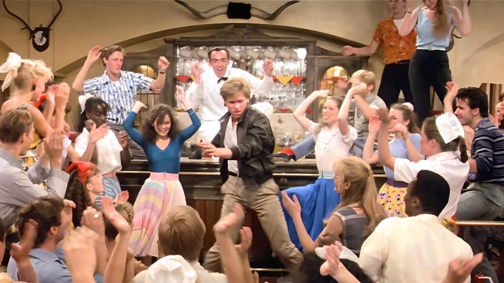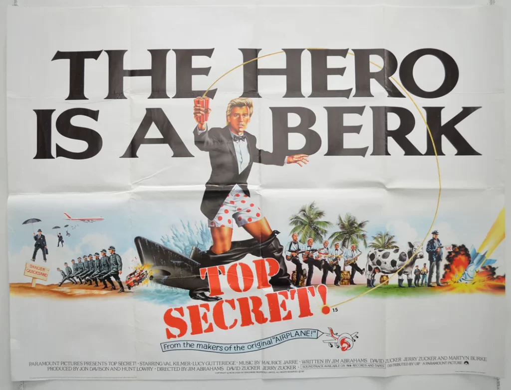 33. LOS CRÉDITOS FINALES ESTÁN REPLETOS DE CHISTES. Los propios créditos finales incluyen chistes con descargos de responsabilidad aleatorios o notas de agradecimiento falsas. Este truco también se usó en «Airplane!», pero «Top Secret!» lo lleva más allá, animando a los fans a quedarse hasta que la pantalla se quede en blanco. Un par de ejemplos: aparece un espacio para alquilar con un sutil “This space for rent”, hay créditos falsos con juegos de palabras en inglés («Hey diddle diddle — The cat and the fiddle», «Foreez — A jolly good fellow», etc.) y Nick y sus coristas aparecen como un grupo auténtico… Si bien no todos captan estos detalles ocultos, quienes lo hacen aprecian la frutilla extra del pastel cómico.