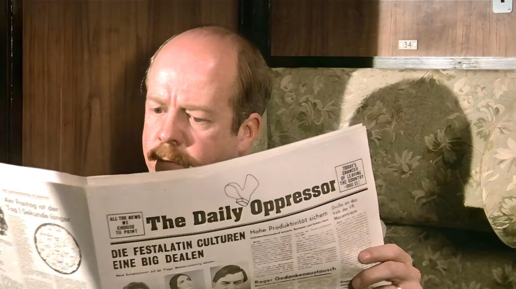 20. CADA SET TENÍA CHISTES OCULTOS. La regla de «nunca desperdiciar un set» los guió a insertar gags rápidos siempre que fuera posible. Si tenían un pasillo, averiguaban cómo hacer que un personaje se resbalara con una cáscara de plátano. Si había un granero, al azar mostraban un burro con sombrero. Los diseñadores del set se superaron a sí mismos con extraños carteles de propaganda. Por ejemplo, se puede ver un eslogan en mitad alemán, mitad inglés, alabando las «libertades de la gente local». El film contiene bastantes gags escritos como por ejemplo cuando el manager de Nick Rivers está leyendo un periódico titulado The Daily Oppressor o cuando en la escena de la librería sueca se observa un libro titulado “Lesbian bars of North Carolina”. A los miembros del equipo les resultaba agotador, pero los resultados hablan por sí mismos: los espectadores observadores encuentran por todas partes los así llamados «huevos de Pascua» (de los cuales en MADHOUSE hablamos en este informe de la peli «Rocky Horror Picture Show»), detalles cómicos que recompensan todas las veces que volvés a verla.