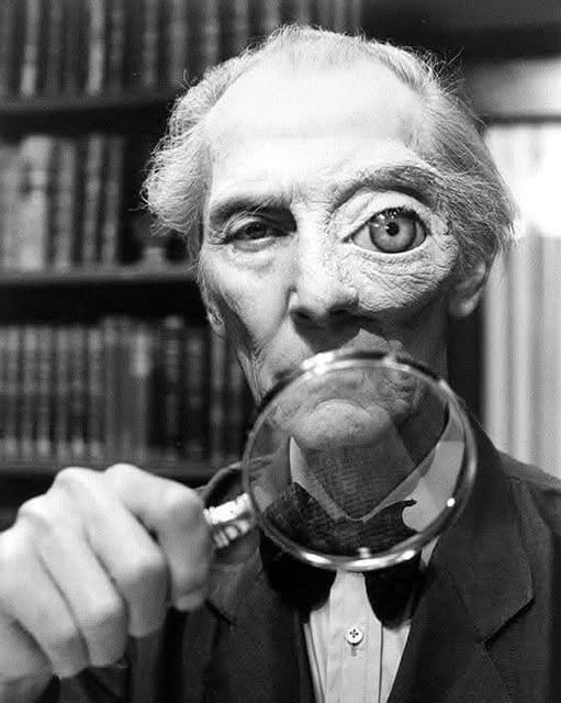 15. EL GAG DEL OJO GIGANTE DE PETER CUSHING SE CREÓ CON EFECTOS PRÁCTICOS. En la escena donde mira un libro a través de una lupa y al retirarla de su rostro su ojo se ve enorme, no hubo ningún efecto especial computarizado: en esa época aún no se usaban. Fue así que para lograr esta imagen, se usó un maquillaje facial que mostraba un ojo de gran tamaño. La protesis era tan pesada que apenas podía mover la cabeza cuando lo tenía puesto… Cushing, talentoso actor conocido por sus innumerables papeles en películas de terror serio, disfrutó muchísimo de su escena. Incluso improvisó algunos momentos adicionales, como parpadear dramáticamente solo para enfatizar el efecto. BONUS: El molde de yeso de la cabeza de Cushing usado para crear la prótesis ocular en «Top Secret!» fue vuelto a usar para el CGI (Computer Generated Imagery, es decir las imágenes creadas con un software informático) de «Star Wars: Rogue One» (2016)