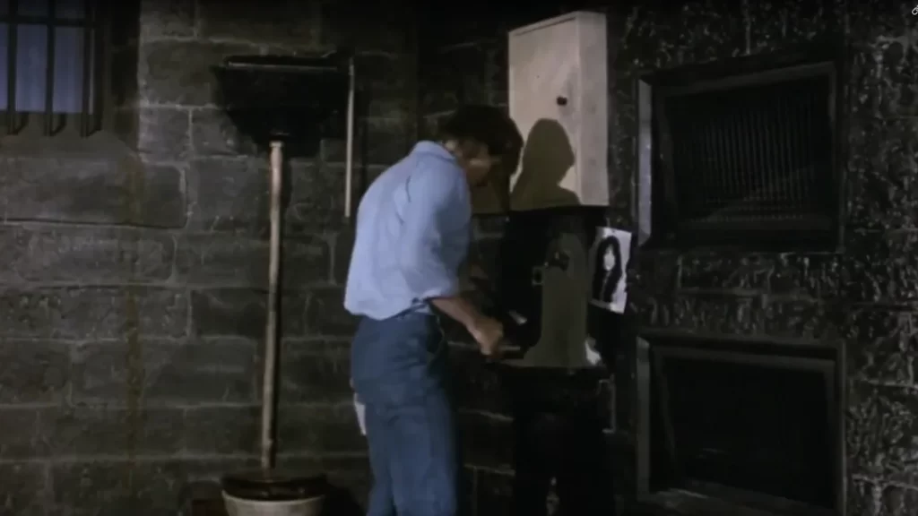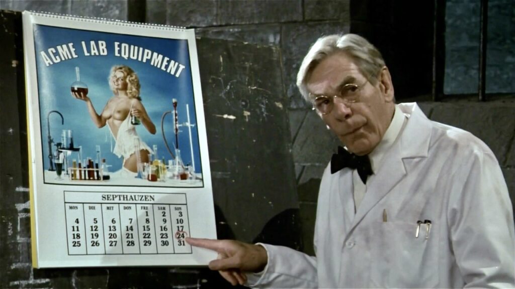 14. LA ESCENA DE LA LIBRERÍA SUECA FILMADA AL REVÉS ES TOTALMENTE REAL. La escena donde los personajes hablan al revés no se filmó con trucos de cámara ni corriendo la imagen en reversa. Todo fue coreografiado y filmado al revés, y luego reproducido al revés para que pareciera normal, añadiendo otra capa de absurdo. Se ven peces volando de vuelta a una pecera, libros flotando hacia las estanterías Los diálogos se memorizaron línea por línea en fonética inversa, minuciosa y escrupulosamente. Los actores tuvieron que entrenar con profesores de dicción solo para pronunciar las palabras al revés. Incluso ensayaron movimientos corporales y manejo de utilería al revés. Luego, el metraje se invirtió durante la edición. Fue todo tan complicado que la escena tardó cuatro días enteros en rodarse para solo un minuto en pantalla. El resultado: un momento surrealista que aún se estudia en las escuelas de cine como una de las escenas más extrañas jamás realizadas. Tiempo después, Cushing consideró que esta fue sin dudas la escena mas extraña de toda su vasta carrera.