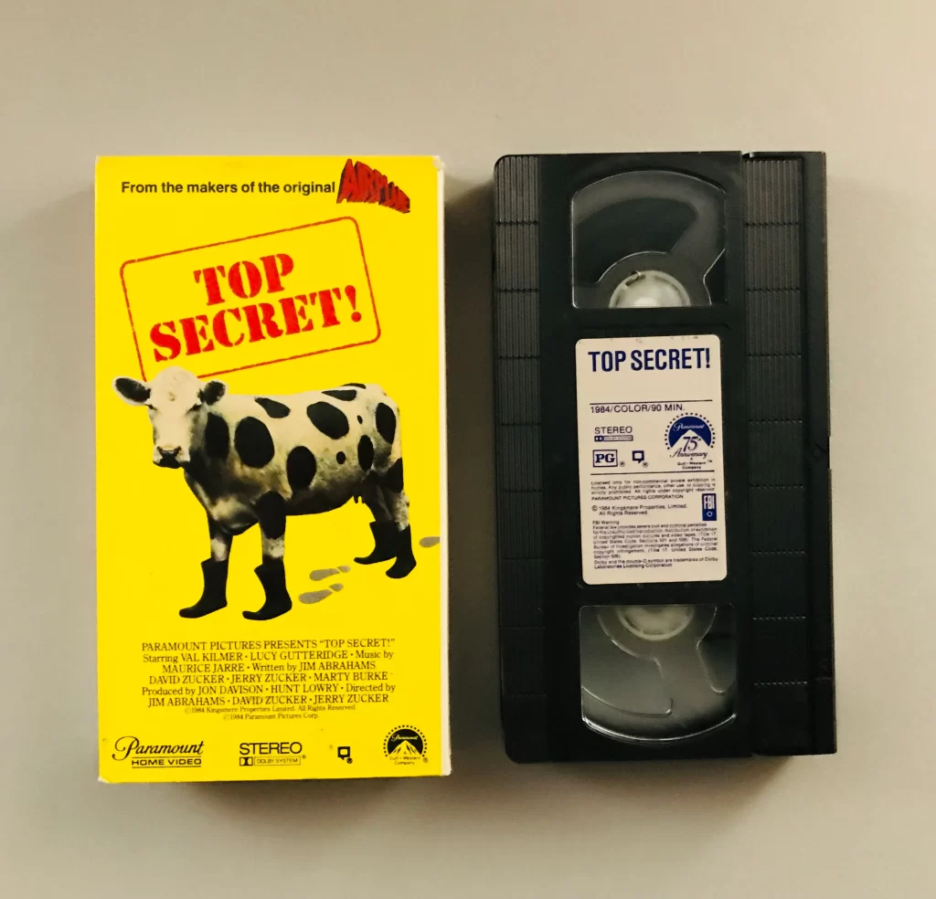 39. EL HOME VIDEO FUE LA SALVACIÓN. Top Secret! desarrolló un culto de seguidores en gran parte a través del video casero y la televisión por cable. Pasó de boca en boca en las residencias universitarias y entre los círculos de aficionados a la comedia; la gente la alquilaba por curiosidad y luego la volvía a ver varias veces para captar los chistes que se había perdido y así se volvió una de las películas más alquiladas de todos los tiempos en los ya extintos videoclubes.