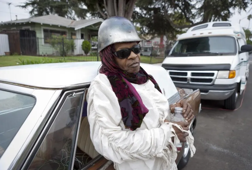 Sly en sus íltimos años, con la van que le servía de casa ahí al fondo.