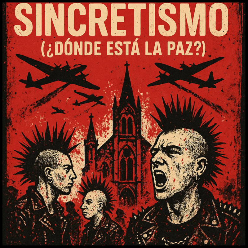 La tapa es una extensión del tema. Está la pregunta “¿Dónde está la paz?”, y lo que mostramos es justamente la contradicción: una iglesia católica —pero la crítica va más allá, es contra toda institución religiosa— que está rodeada por aviones de guerra, ciudades al borde del bombardeo. Es decir: donde debería haber paz, hay amenaza. Y en ese paisaje aparecen los punks. No como un adorno, sino como el grito incómodo. El punk para nosotros tiene que estar ahí, diciendo verdades, incomodando, diciendo lo que muchos saben, pero pocos dicen. La tapa es eso: una denuncia visual cruda y concreta.